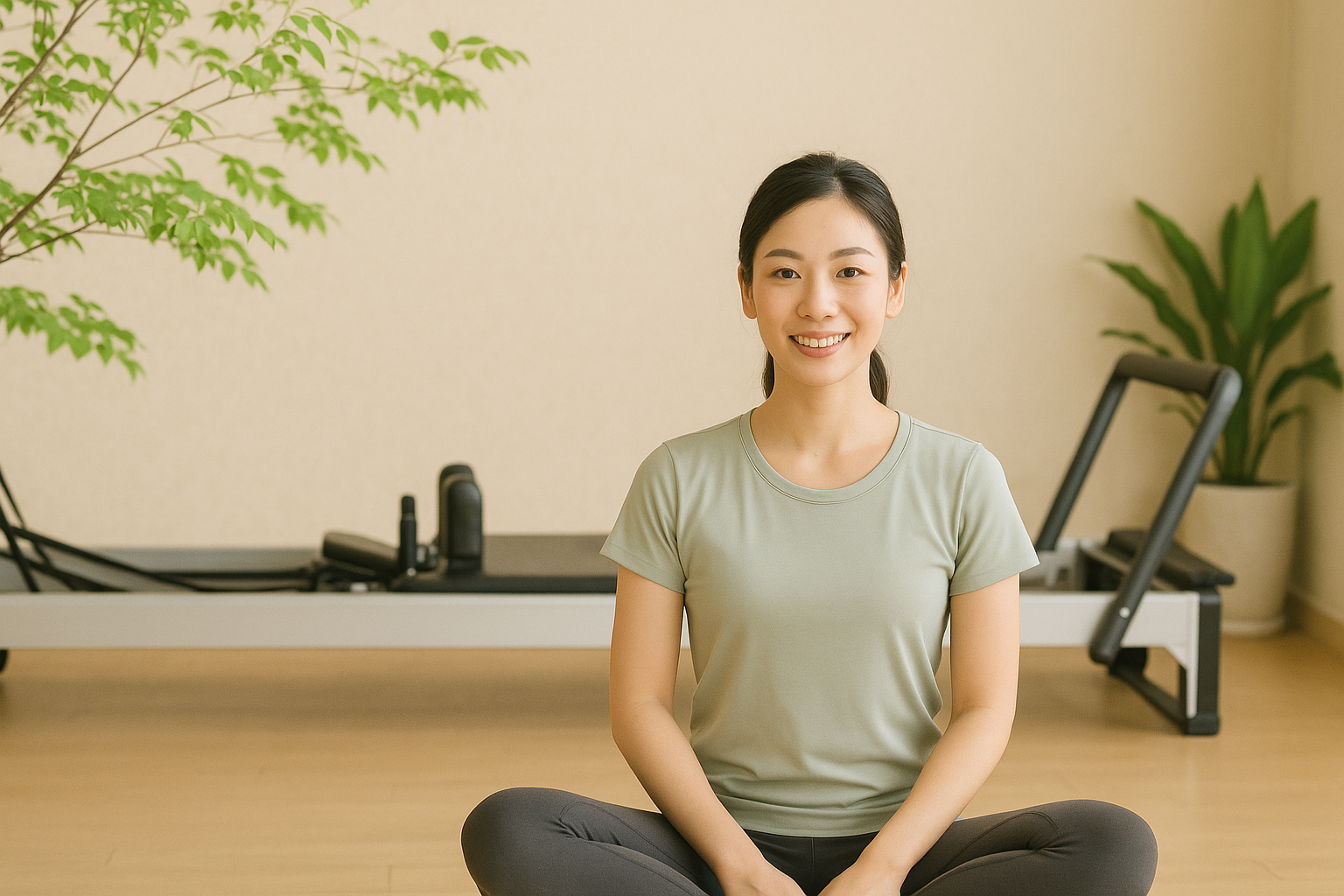 5月の爽やかな雰囲気を感じさせるピラティススタジオで、若い東アジア系の女性が落ち着いた表情で座っている様子。背景には新緑の観葉植物やリフォーマーが映り、姿勢と呼吸を整える穏やかな時間をイメージさせる一枚。豊橋のピラティススタジオkotipilatesの静かで心地よい空間を象徴するビジュアル。